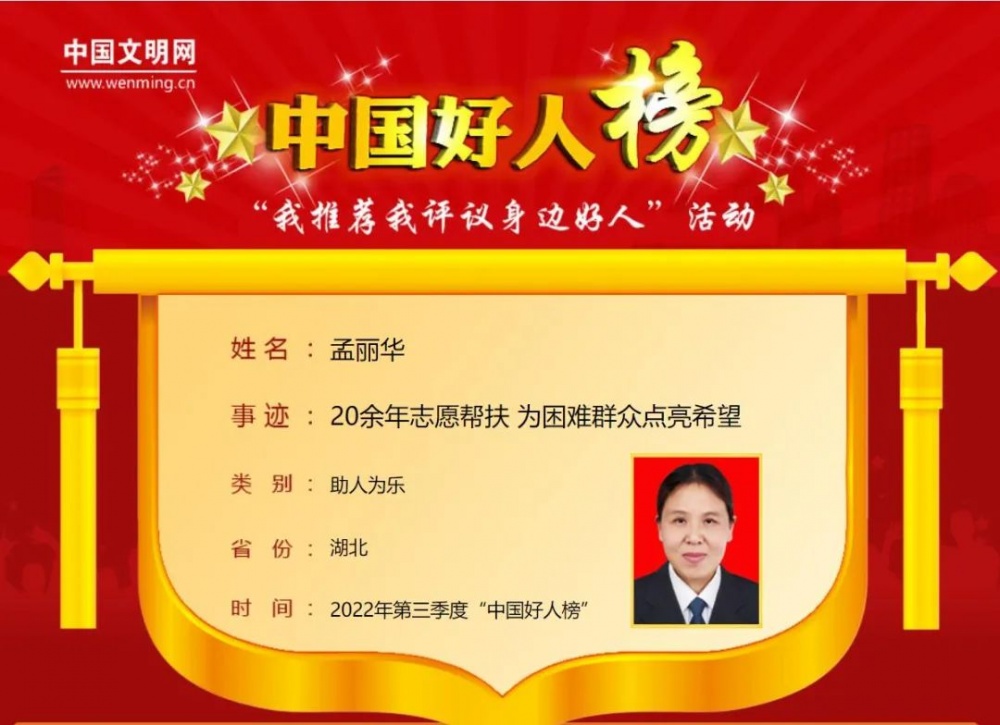 孟麗華,女,漢族,1970年生,中共黨員,荊門市公共交通集團(tuán)有限公司點(diǎn)鈔中心副主任、荊門市圓夢愛心幫扶會會長。二十多年來,孟麗華通過捐資助學(xué)、扶老助殘、幫扶貧困,將幾十多萬元工資獎金和全部工余時間都用來做志愿服務(wù),把助人當(dāng)做自己的快樂和幸福,向社會傳遞著溫暖和關(guān)愛。先后獲得全國三八紅旗手、全國孝親敬老之星、湖北省五一勞動獎?wù)隆⑶G楚楷模、湖北省十大愛心助殘人士、崗位學(xué)雷鋒標(biāo)兵等榮譽(yù)稱號。