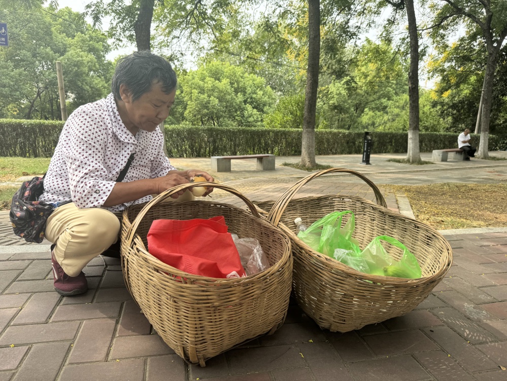 臨近正午,石大娘削著梨果充饑,等待回家公交車(chē)到來(lái)。