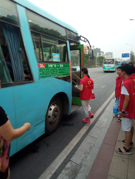 15時(shí)許,志愿者們已經(jīng)布置好了送水點(diǎn),將箱礦泉水?dāng)[在了站臺(tái)旁邊。每有一輛公交車進(jìn)站???,志愿者們都會(huì)給駕駛員們遞上兩瓶礦泉水,還有一些放暑假的小朋友們,也熱情的加入到此次活動(dòng),充當(dāng)著志愿主力軍,用他們的行動(dòng)清涼了公交駕駛員的心,傳播著社會(huì)正能量。