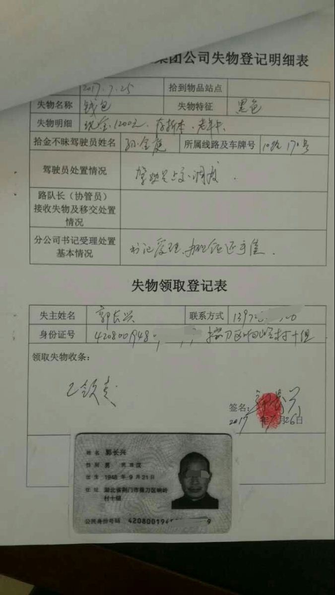 7月25日上午家住漳河新區(qū)響嶺村的69歲的郭大爺在掇刀石街辦附近購(gòu)物后,坐10路車到白石坡一理發(fā)店理發(fā),剛在理發(fā)店坐下他發(fā)現(xiàn)錢包不見了。他回想錢包可能掉10路公交車上了。遂到返回到掇刀石派出所找民警幫忙。民警建議他到10路終點(diǎn)站金銀島查找。
