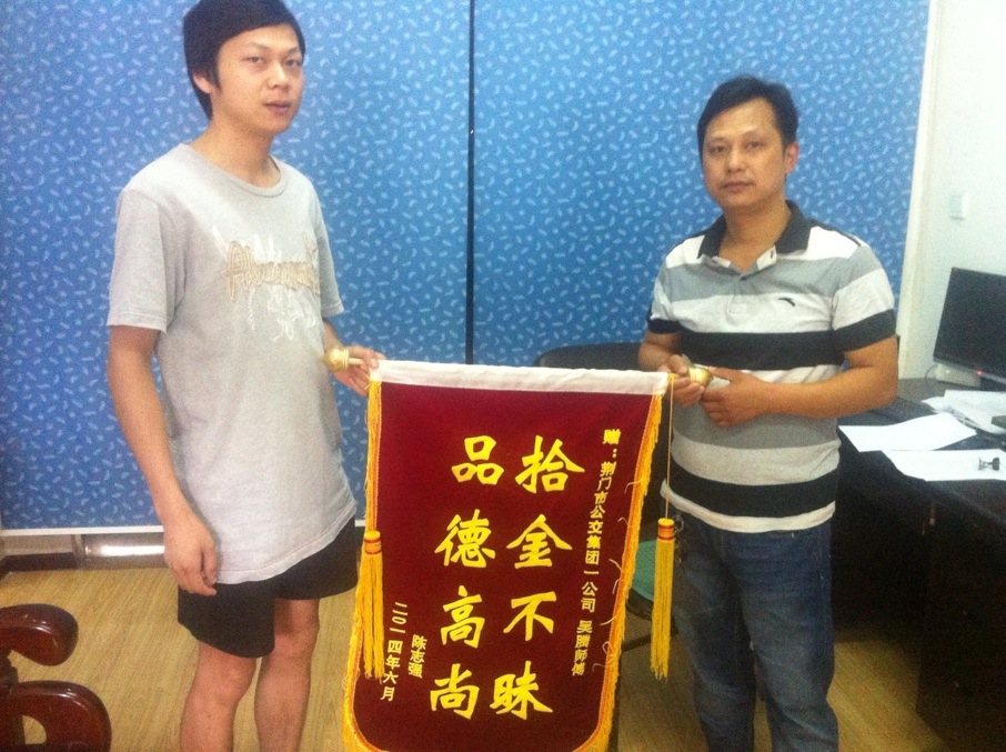 原來,15日下午2時許,1路公交車司機吳騰驅(qū)車途經(jīng)城區(qū)長寧大道長寧8號廣場(中百倉儲)公交站點時,在馬路中央撿到一個黑色皮包,并及時上交到公交集團公汽一公司。公司負責人將皮包內(nèi)身份證信息通過《荊門晚報》及荊門社區(qū)網(wǎng)絡媒體發(fā)布尋找失主陳先生信息,陳先生看到招領信息后,很快得知錢包的下落了,他說這(找回錢包)是他萬萬沒想到的。18日上午,陳先生順利地從公汽一公司負責人手中認領到丟失的錢包,并特意為吳師傅制作了一面"拾金不昧 品德高尚"錦旗表示謝意。