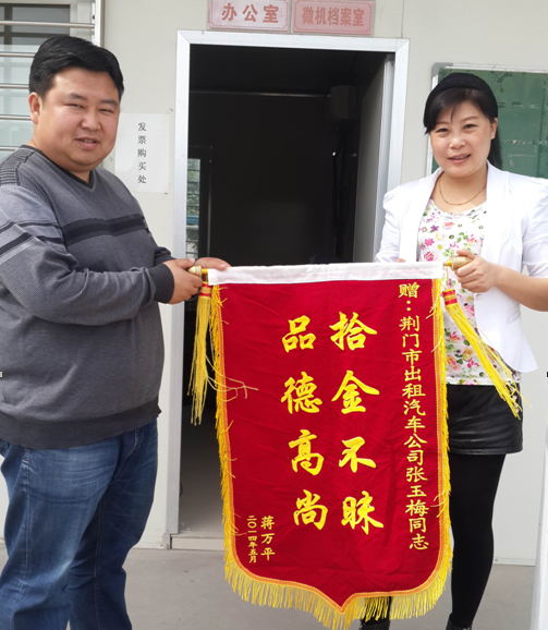 5月4日,乘客蔣女士從市出租汽車公司領(lǐng)回丟失的蘋果iphone5s手機(jī),感動萬分,并送上印有“拾金不昧品德高尚”錦旗,以表達(dá)對的姐張玉梅的謝意。