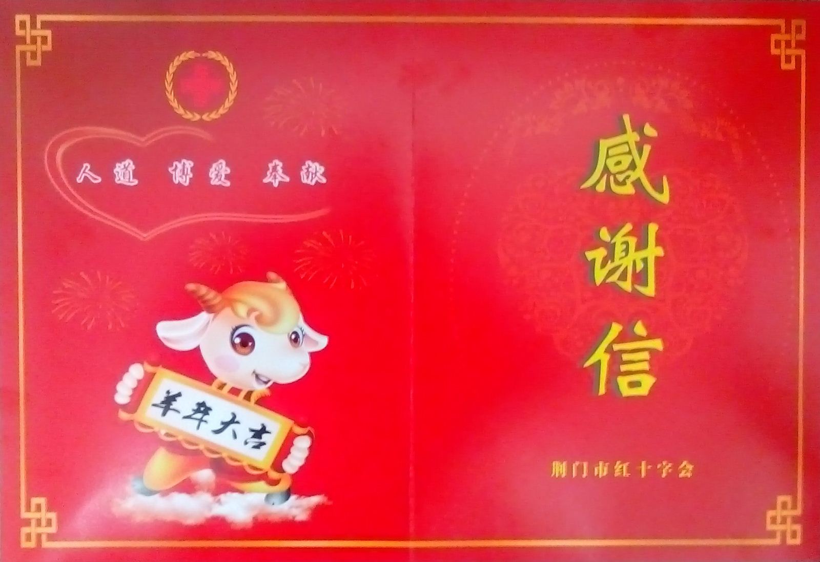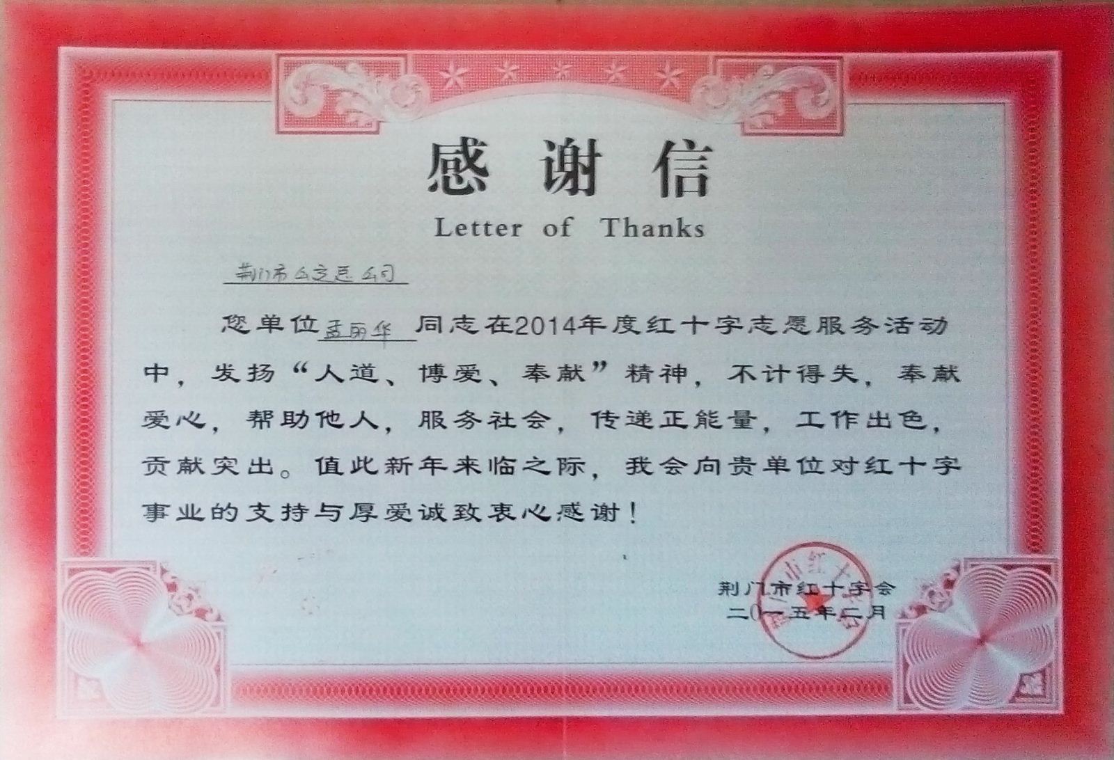孟麗華收到荊門(mén)市紅十字會(huì)感謝信
