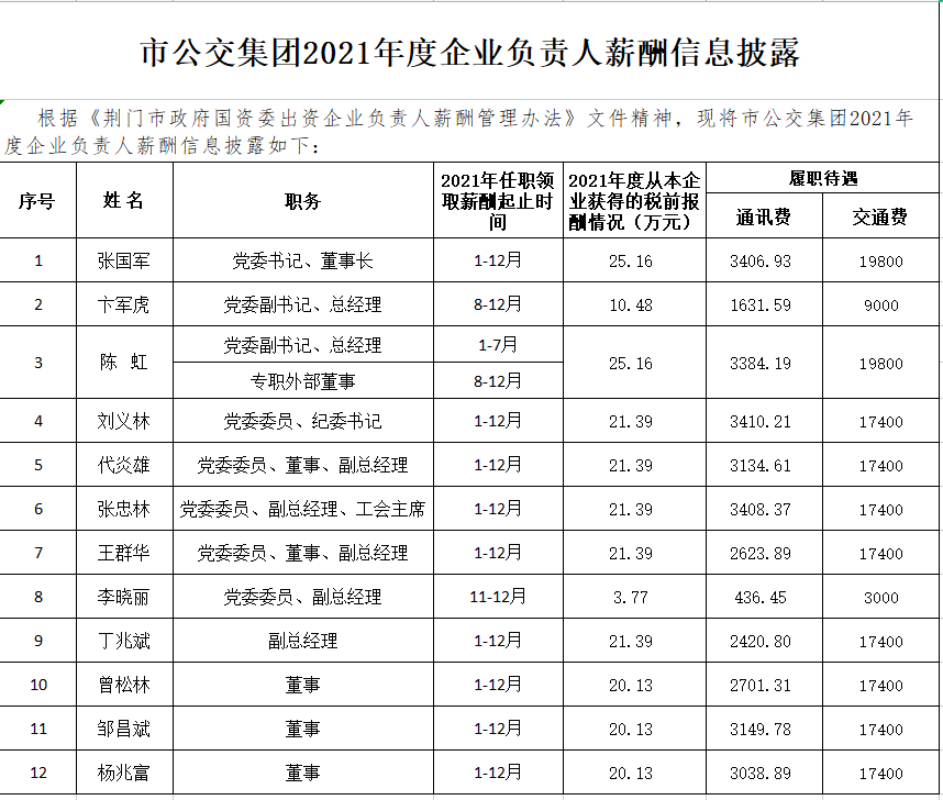 市公交集團2021年度企業(yè)負(fù)責(zé)人薪酬信息披露