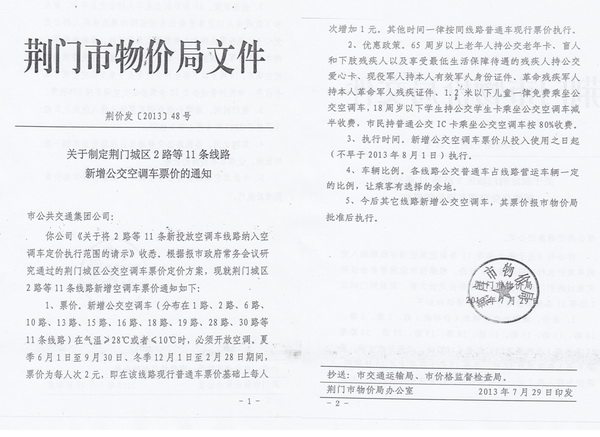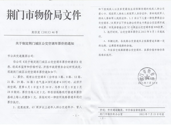 根據(jù)荊門市物價局《關于制定荊門城區(qū)公交空調車票價的通知》(荊價發(fā)[2013]46號)及《關于制定荊門城區(qū)2路等11條線路新增公交空調車票價的通知》(荊價發(fā)[2013]48號),公交空調車2014年6月1日至9月30日營運時段內執(zhí)行2元/人次票價,現(xiàn)就執(zhí)行公交空調車票價后的有關事項公告如下: