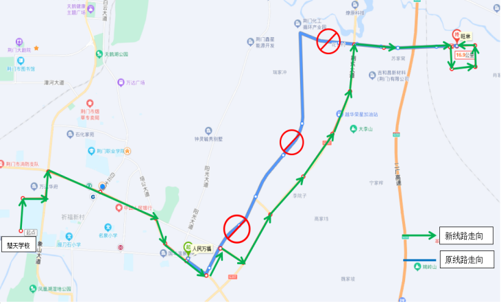 一.優(yōu)化調(diào)整33路公交線路走向 ◆首末站:楚天學(xué)?!郑ㄐ】的下繁保?/p> ◆首末班時間:6:50—17:45 ◆線路走向:響嶺路—運(yùn)動公園路—象山大道—深圳大道—培公大道—荊和大道—深圳大道—荊東大道—興化三路—格林北路—興化四路—小康南路 ◆??空军c(diǎn):楚天學(xué)校、雙喜街辦、運(yùn)動公園路、萬達(dá)廣場、掇刀檢察院、掇刀法院、掇刀公安分局、南城明珠、中國人民銀行、市氣象局、襄荊高速、雙泉社區(qū)、人民萬福商貿(mào)城、人民一品花園、虎頭山、殯儀館、馮廟村、固潤科技、東方雨虹、圣通石化、荊東消防、荊東大道興化五路口、潤都制藥、興化三路西、興化三路中、興化三路盈德氣體、紐蘇萊、旺林、興化四路、小康南路北。 ◆取消原33路途經(jīng)荊和大道等路段站點(diǎn):荊和大道南、陽光五路、陽光四路、陽光三路、化工產(chǎn)業(yè)園行政大樓。 二.優(yōu)化調(diào)整69路公交發(fā)班時間 ◆調(diào)整前 園博園東門發(fā)班時間:6:40、7:40、15:30、16:30、17:15 玲瓏輪胎發(fā)班時間:7:30、8:30、16:30、17:30、18:00 ◆調(diào)整后 園博園東門發(fā)班時間:6:40、7:20、15:30、16:30 玲瓏輪胎發(fā)班時間:7:30、8:20、12:20、16:20、17:30